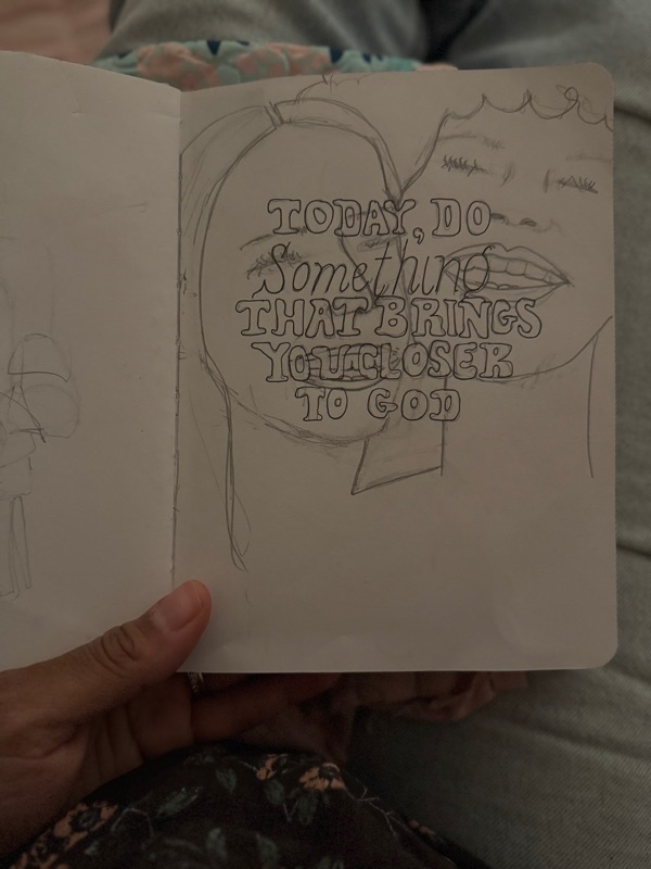 One day, as I made a habit of keeping my sketchbook on hand, ready to sketch whenever the moment struck, I found myself in need of some inspiration. I turned to my trusty app, Pinterest. I went straight to a new board I had recently filled up with quotes in cool, trendy typography. As I scrolled through, one quote stood out to me: “Today, do something today that brings you closer to God.” I knew exactly why I had saved this quote—it was exactly what I needed to hear. It felt like a reminder to return to simplicity, to focus on what truly matters. The moment I read it, I felt grounded and peaceful.