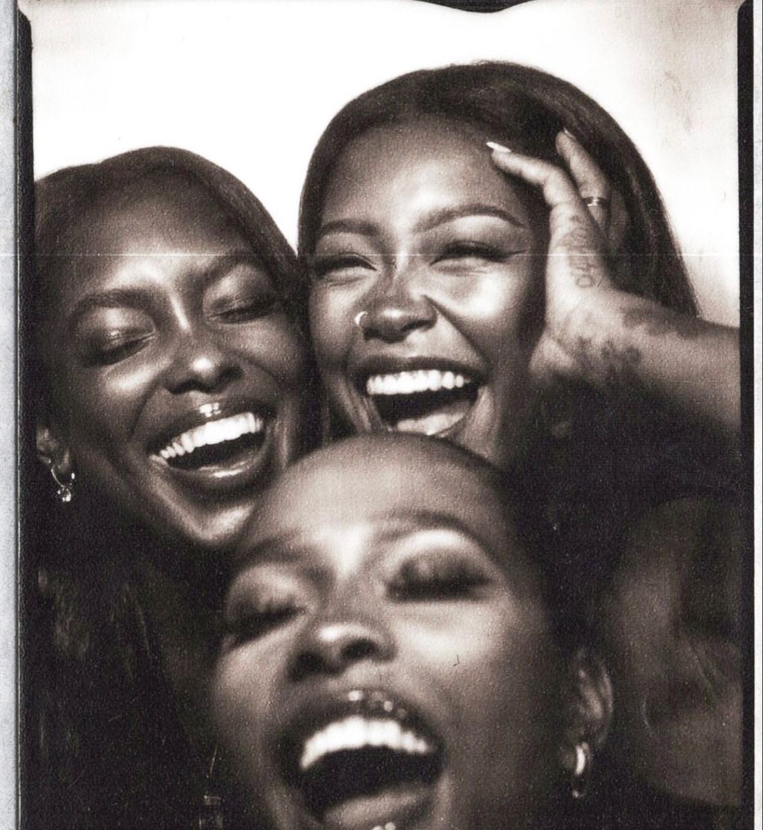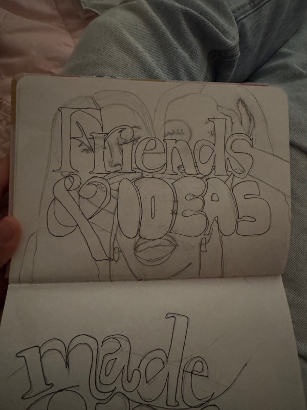 I decided to simply copy the quote, exactly as I saw it, into my sketchbook, but as I looked at it, something felt like it was missing. So, I went to another board I’d filled with images of faces—mostly beautiful, joyful women. Smiles, moments of happiness, faces captured in time. As I looked through these faces, I realized the sketch of the quote would be perfect with a face behind it. Specifically, two women’s smiling faces.